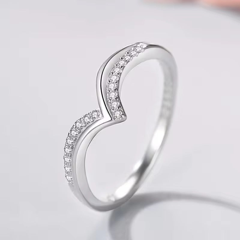 This elegant piece features a deep "V" or chevron silhouette, inspired by the lucky wishbone. The front of the V is lined with a row of brilliant-cut crystals, adding a precise line of sparkle that draws the eye. The unique pointed shape naturally elongates the look of your finger, making it incredibly flattering. Wear it point-down for a boho-chic vibe, or wear it as a "crown" above your favorite solitaire ring to give it a fresh new look.