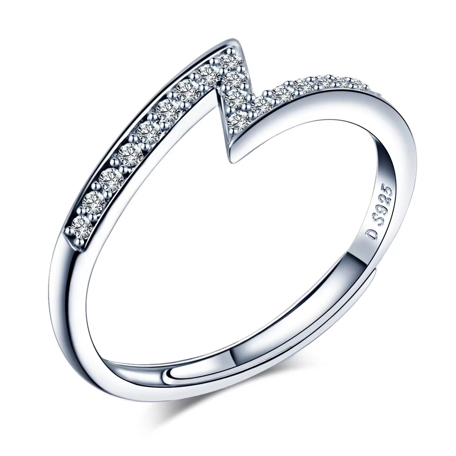 This bold, geometric piece features a sharp "lightning bolt" or "heartbeat" motif that jags across the finger. The zigzag pattern is meticulously paved with brilliant-cut crystals, creating a continuous line of fire and brilliance. It’s a modern, edgy alternative to traditional curved bands, perfect for stacking or wearing alone as a statement of power and vitality.